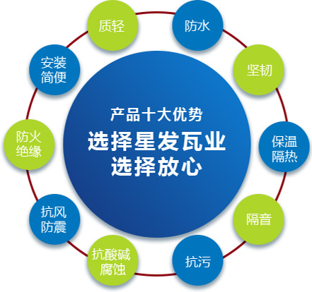 公司主要產(chǎn)品有《星發(fā)牌》合成樹脂瓦、APVC防腐耐候復(fù)合瓦、APVC發(fā)泡隔熱瓦、PVC半透明瓦、PVC防腐隔熱瓦、PVC防腐瓦、PVC防腐平板、PVC條紋板和ASA/PVC超耐候復(fù)合瓦等產(chǎn)品。產(chǎn)品一經(jīng)推出,已被廣泛應(yīng)用于國內(nèi)各類平改坡項(xiàng)目和大型工業(yè)項(xiàng)目,遠(yuǎn)銷歐洲、亞洲、美洲和非洲等國外市場,還獲選為廣州亞運(yùn)會、深圳大運(yùn)會、四川災(zāi)后重建等工程項(xiàng)目的應(yīng)用產(chǎn)品。公司在不斷創(chuàng)新和改革的基礎(chǔ)上,力求以更好的產(chǎn)品、優(yōu)良的服務(wù),用心、專心服務(wù)好每一個(gè)客戶。